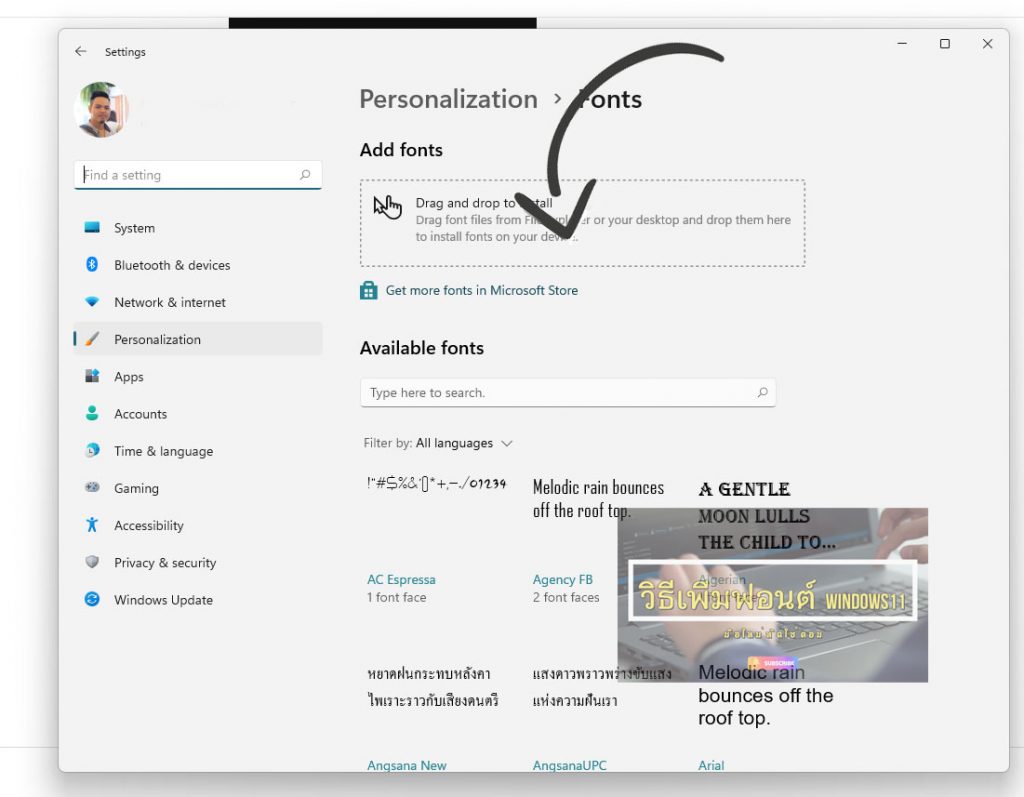 ไปที่ไดร์ C –> เลือกวินโดว์—> เลือก font–> และวางฟอนต์นั้นลง
